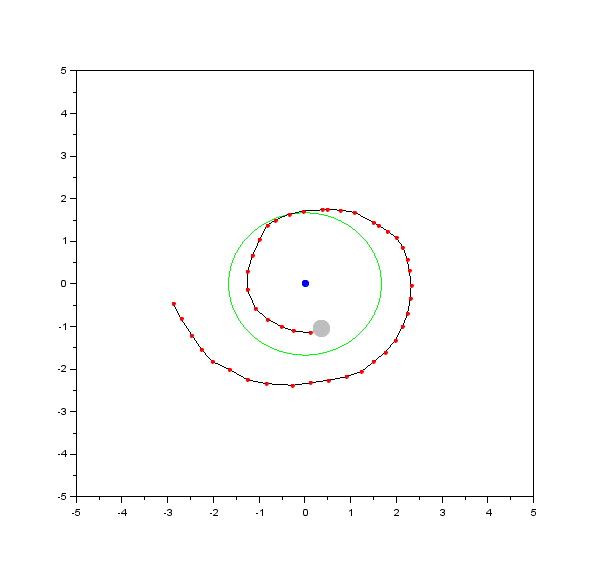 The gif animation and image of the trajectory of the ball on z = 1/r^2 surface in file 'IMG_1300.mov' are shown in the figure, as simple two-dimensional plots.