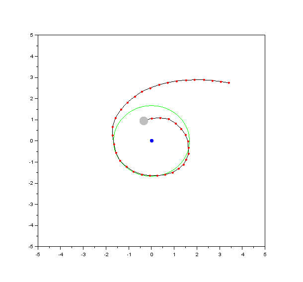 The gif animation and image of the trajectory of the ball on z = 1/r^2 surface in file 'IMG_1512.mov' are shown in the figure, as simple two-dimensional plots.