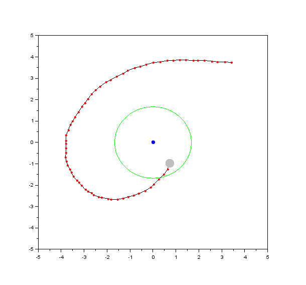 The gif animation and image of the trajectory of the ball on z = 1/r^2 surface in file 'IMG_1616.mov' are shown in the figure, as simple two-dimensional plots.